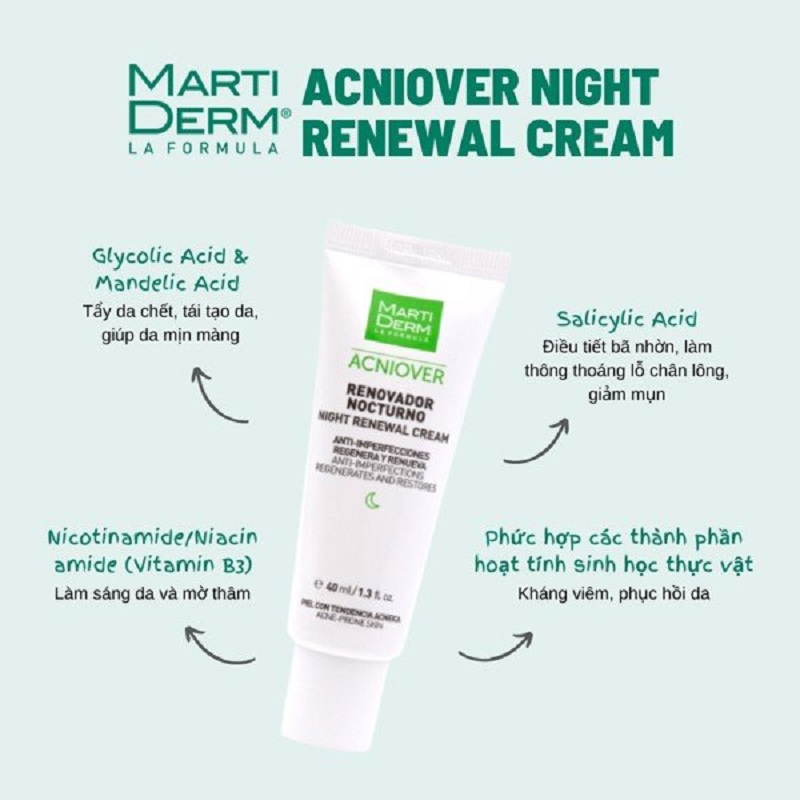 Như các bạn đã biết chăm sóc da hàng ngày giúp chúng ta duy trì làn da trẻ trung và khỏe mạnh. Một làn da căng bóng, mịn màng và trắng sáng là một dấu ấn cho vẻ đẹp của phái đẹp. Để giữ được làn da khỏe mạnh và trẻ trung, một chế độ chăm sóc da chủ động là điều cần thiết. Nếu bạn muốn chăm sóc da một cách hiệu quả thì việc tìm kiếm các sản phẩm đạt chất lượng là rất cần thiết. Hôm nay, tại bài viết này sẽ giới thiệu cho bạn một sản phẩm kem dưỡng da ban đêm MartiDerm Acniover Night Renewal Cream với khả năng tái tạo da, giúp khắc phục triệt để các vấn đề về da mà chị em phụ nữ thường xuyên gặp phải.