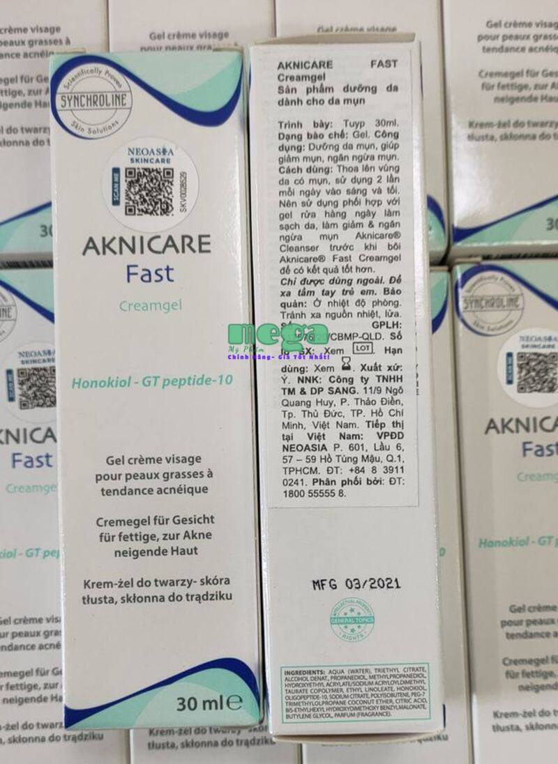 Kem Trị Mụn Aknicare là dòng sản phẩm da liễu duy nhất đã được chứng minh có hiệu quả trong việc tăng sản xuất bã nhờn. Nhờ công nghệ mang tính cách mạng, Aknicare Fast CreamGel có thể chống lại các nguyên nhân gây mụn một cách hiệu quả mà không cần kháng sinh, retinoids và steroid. Nhà sản xuất sản phẩm là General Topics Company, Italy