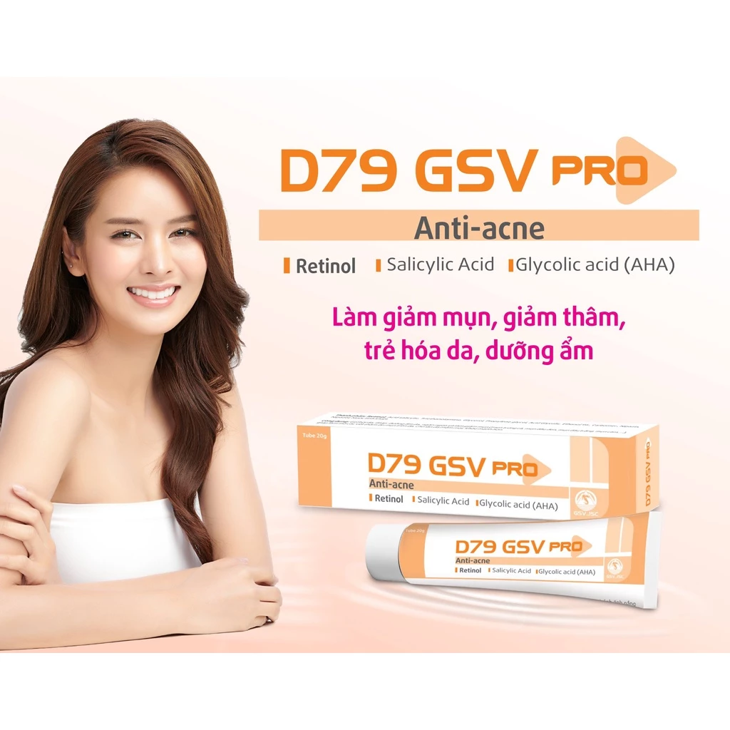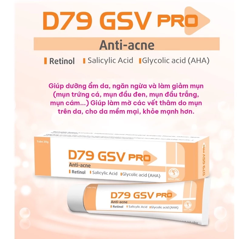 D79 GSV Pro có thành phần bao gồm Puried water, Triethanolamine, Glycerin, Propylene glycol, Glycolic acid, Ethanol, Salicylic acid, Carbomer, Retinol, Methylparaben, Propylparaben. Gel bôi da có tác dụng giúp dưỡng ẩm da, ngăn ngừa và làm giảm mụn (mụn trứng cá, mụn đầu đen, mụn đầu trắng, mụn cám,….) giúp làm mờ các vết thâm do mụn trên da mềm mại, khỏe mạnh hơn.