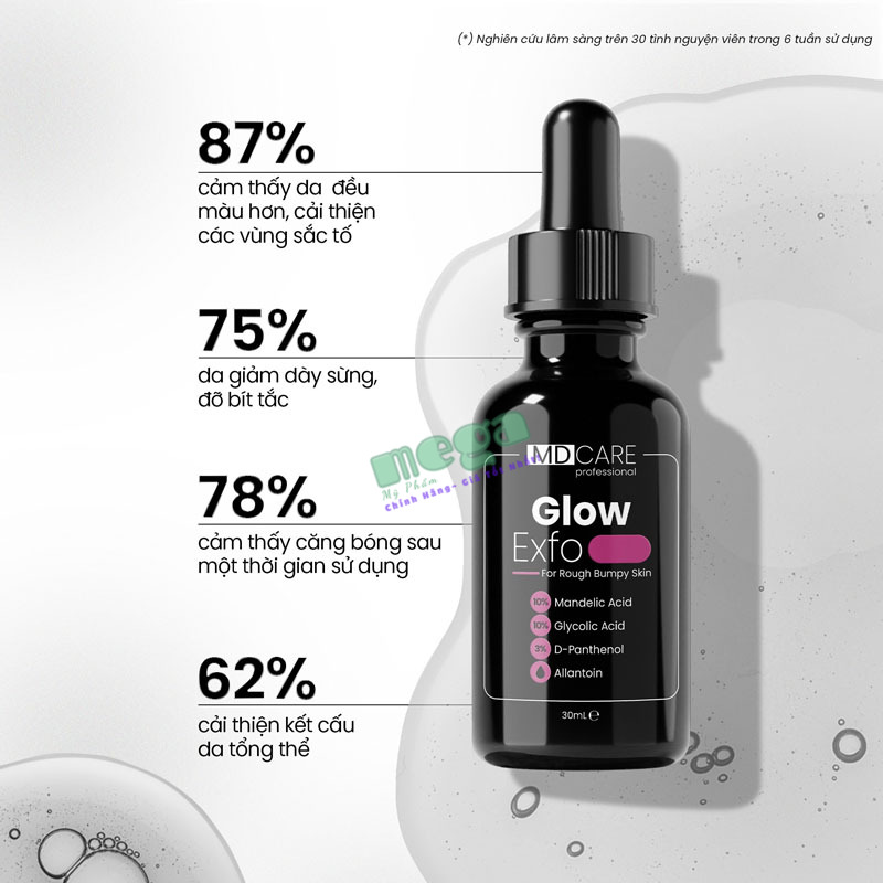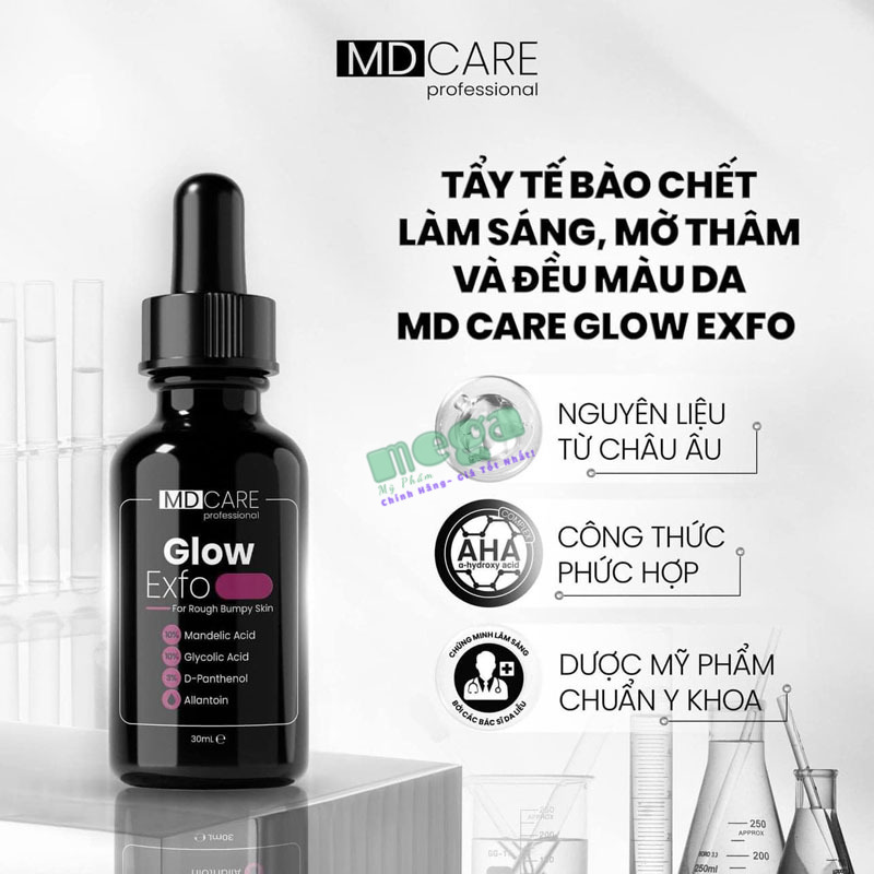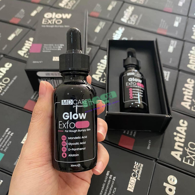 MD Care Glow Exfo (10% Mandelic Acid + 10% Glycolic Acid) là sản phẩm tẩy tế bào chết nhẹ nhàng được điều chế với công thức phức hợp các loại acid AHA độc quyền. Đặc biệt phù hợp với làn da không đều màu, sạm xỉn, thâm mụn hoặc dày sừng nhưng rất an toàn và lành tính.