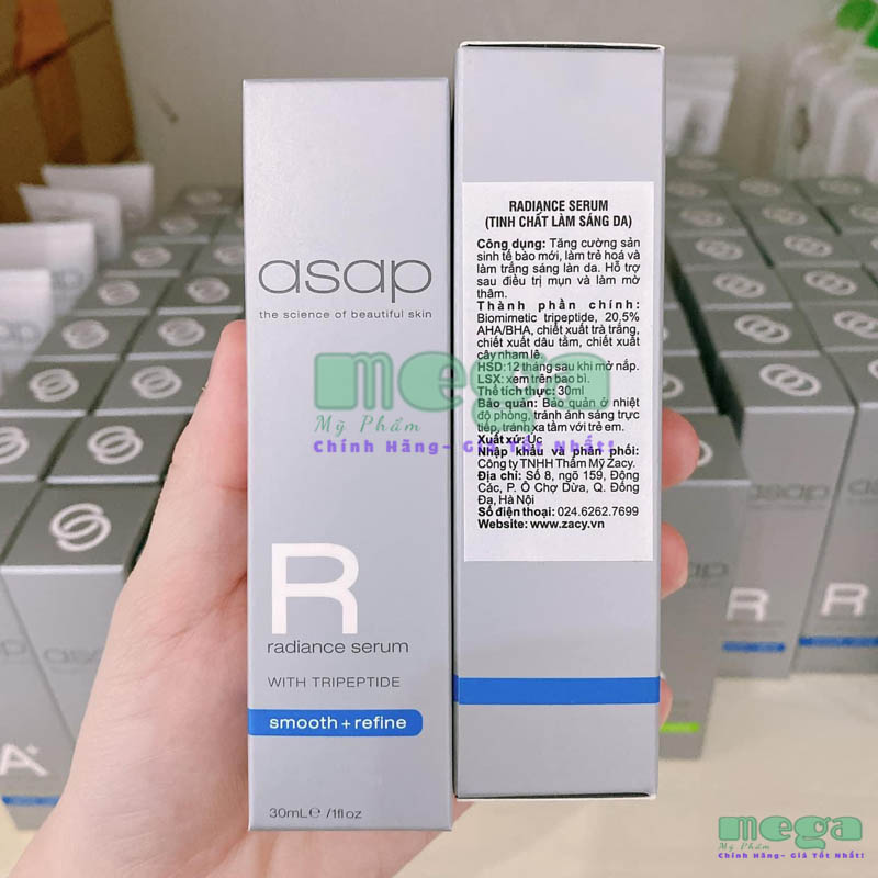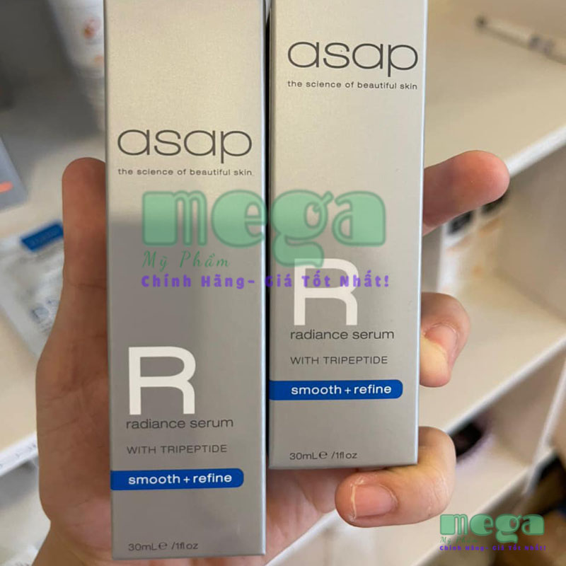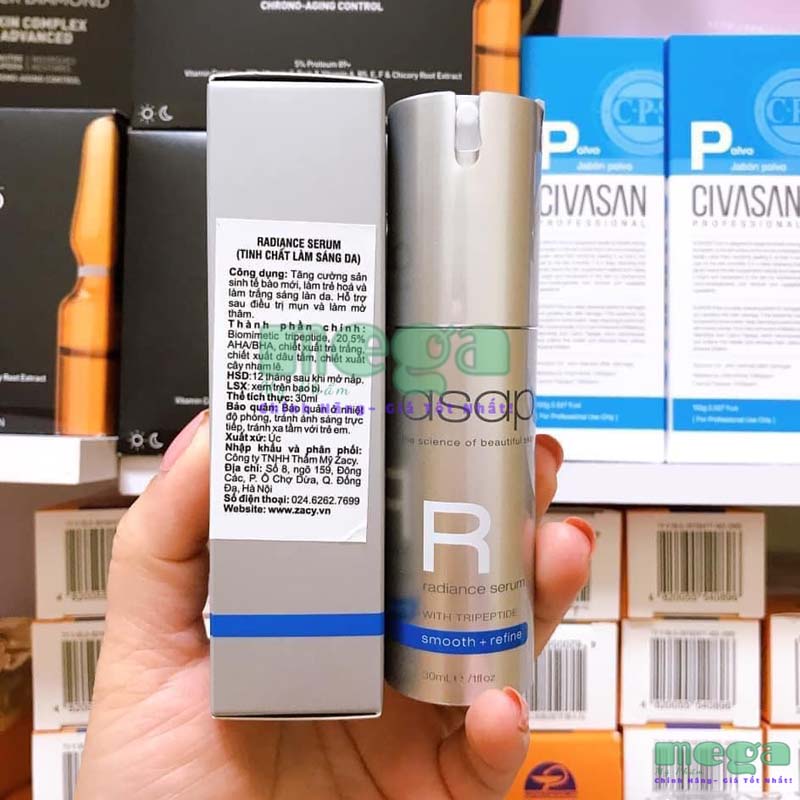 Asap Radiance Serum là cứu tinh cho làn da dầu, da bị mụn, thâm sau mụn. Sản phẩm là sự kết hợp giữa Biomimetic Tripeptide chống lão hóa, hỗn hợp AHA / BHA và chiết xuất thảo dược làm trắng giúp tăng cường tái tạo tế bào, trẻ hóa da, hỗ trợ giảm thâm nám, lão hóa da do mụn.