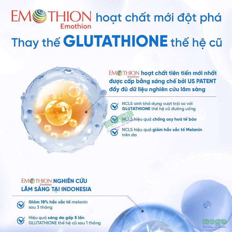 - Với thành phần chủ yếu là Emothion® (S-Acetyl Glutathione), sản phẩm được cấp bằng sáng chế tại Mỹ, mang lại khả năng hấp thụ và ổn định vượt trội, gấp 10 lần so với glutathione thông thường.